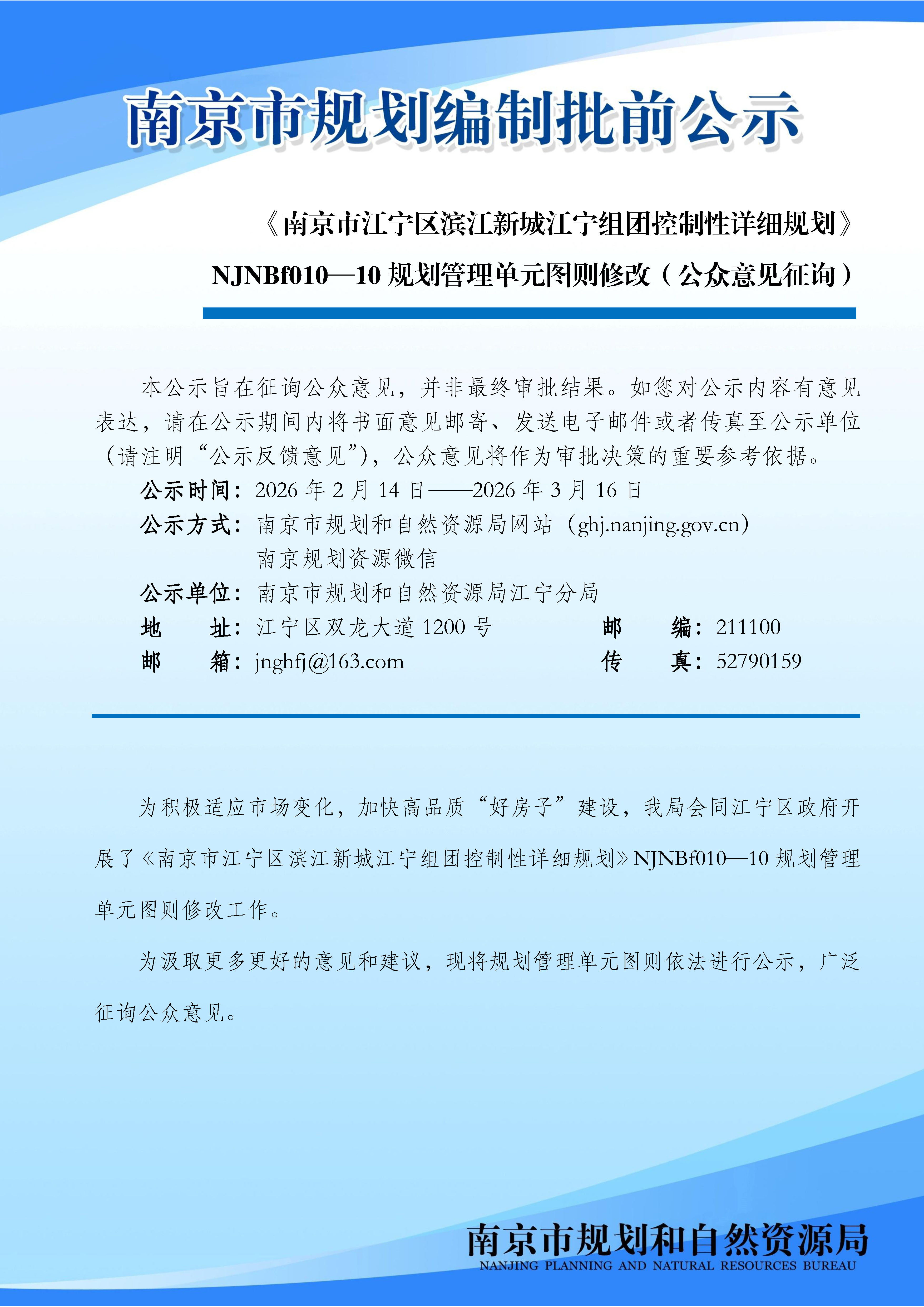 《南京市江宁区滨江新城江宁组团控制性详细规划》NJNBf010—10规划管理单元图则修改(公众意见征询)
