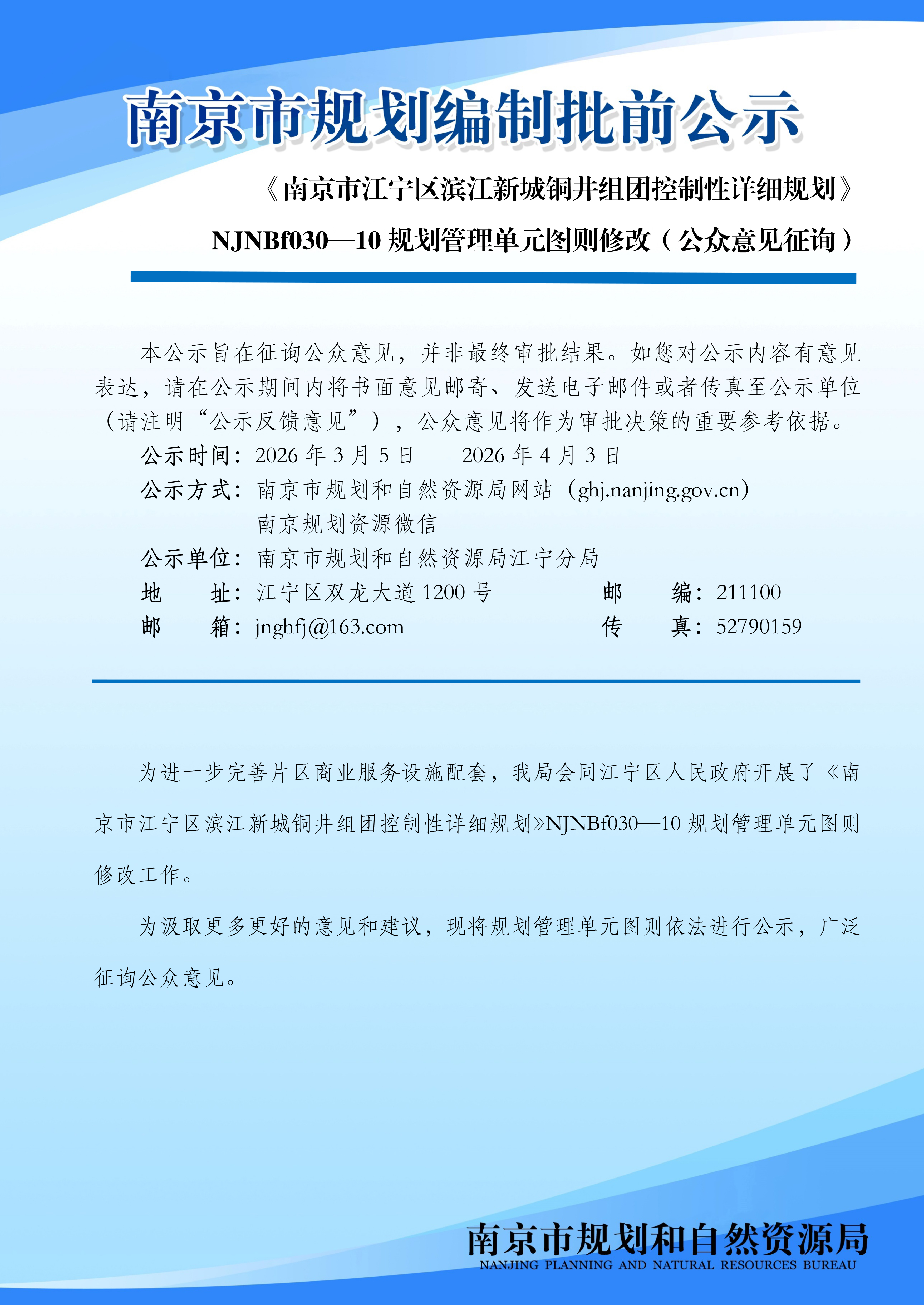 《南京市江宁区滨江新城铜井组团控制性详细规划》NJNBf030—10规划管理单元图则修改(公众意见征询)