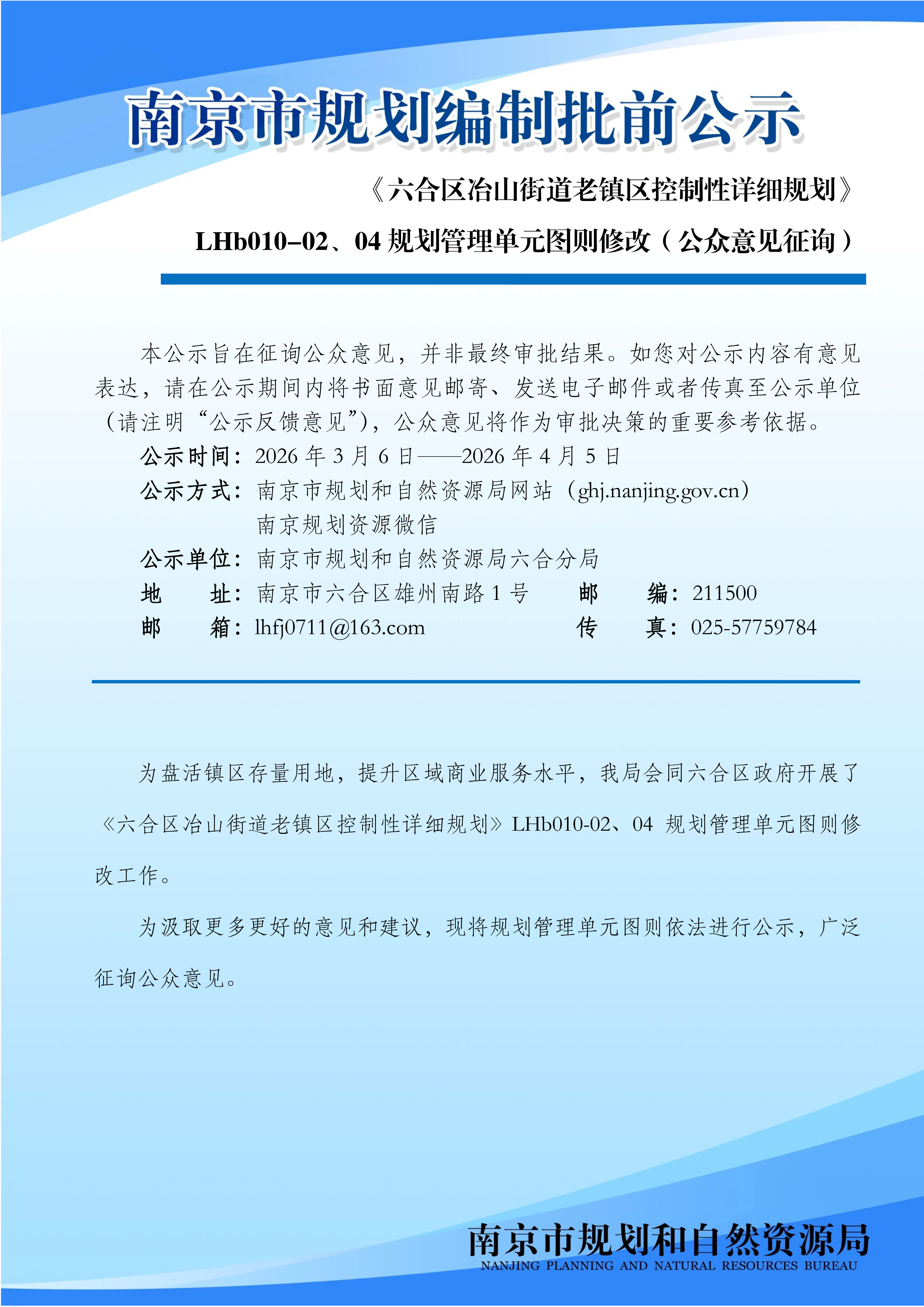 《六合区冶山街道老镇区控制性详细规划》 LHb010-02、04规划管理单元图则修改(公众意见征询)