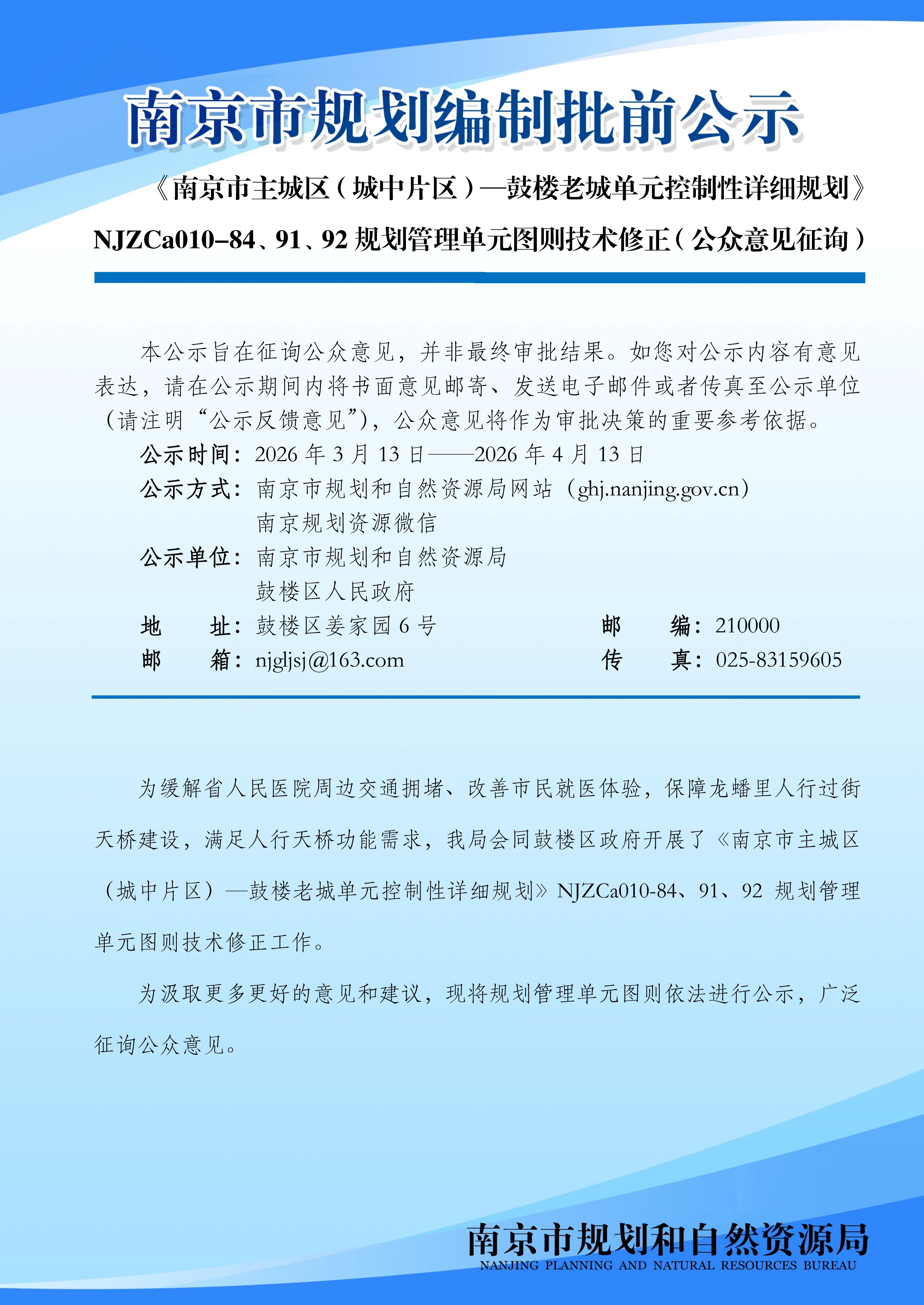 《南京市主城区(城中片区)—鼓楼老城单元控制性详细规划》NJZCa010-84、91、92规划管理单元图则技术修正(公众意见征询)