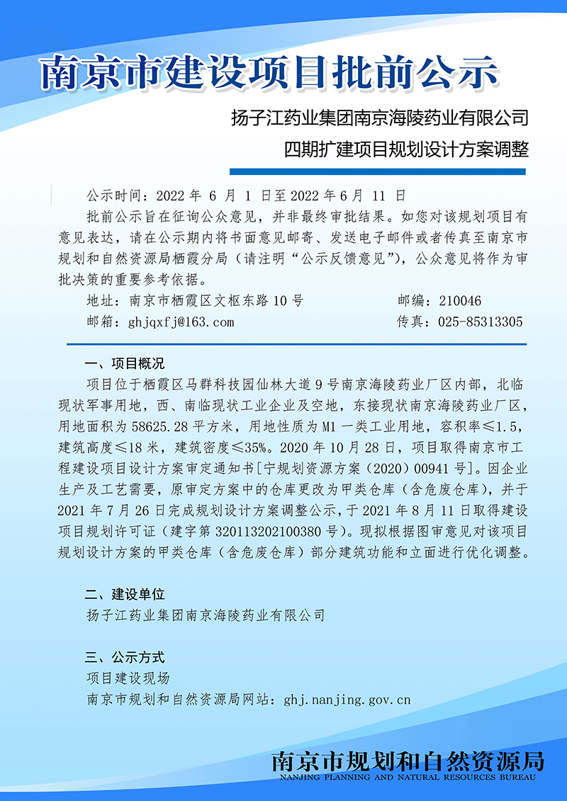 扬子江药业集团南京海陵药业有限公司四期扩建项目规划设计方案调整批前公示