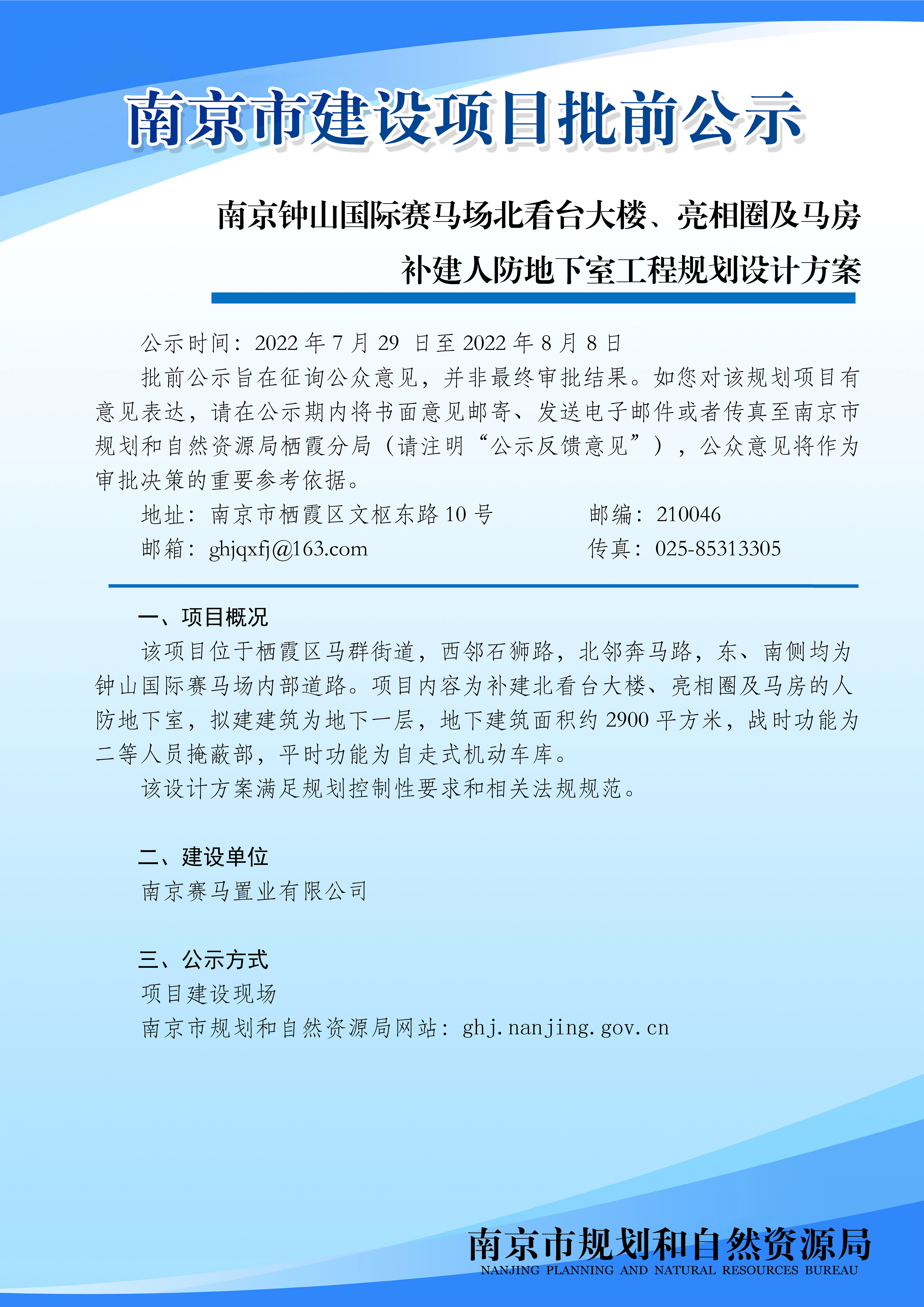 南京钟山国际赛马场北看台大楼、亮相圈及马房补建人防地下室工程规划设计方案批前公示