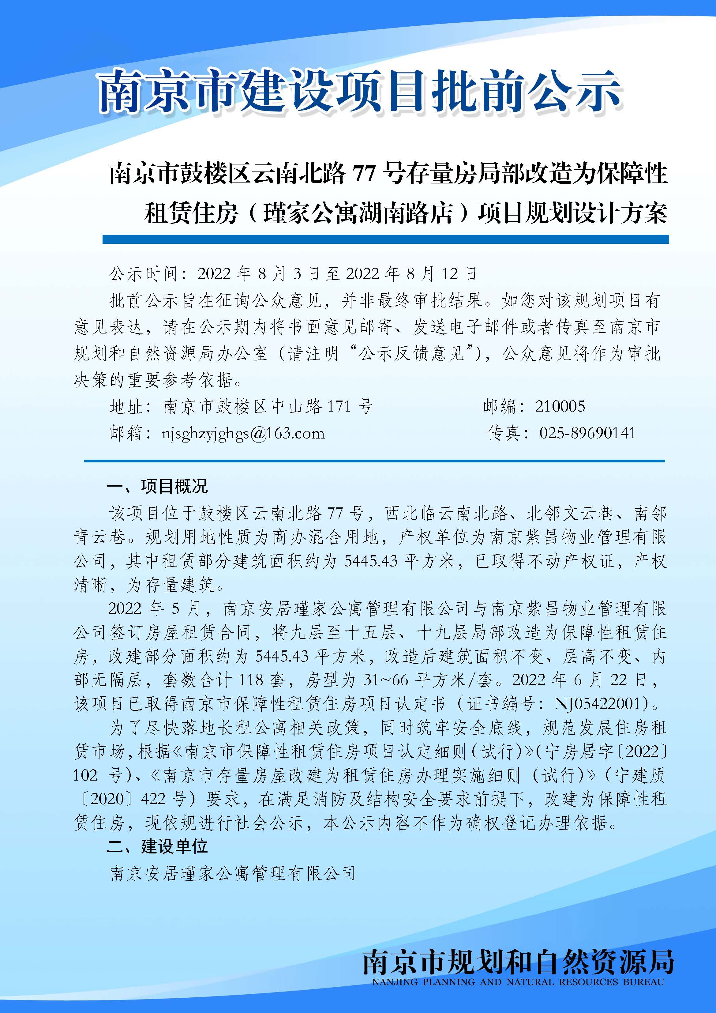 南京市鼓楼区云南北路77号存量房局部改造为保障性租赁住房(瑾家公寓湖南路店)项目规划设计方案批前公示