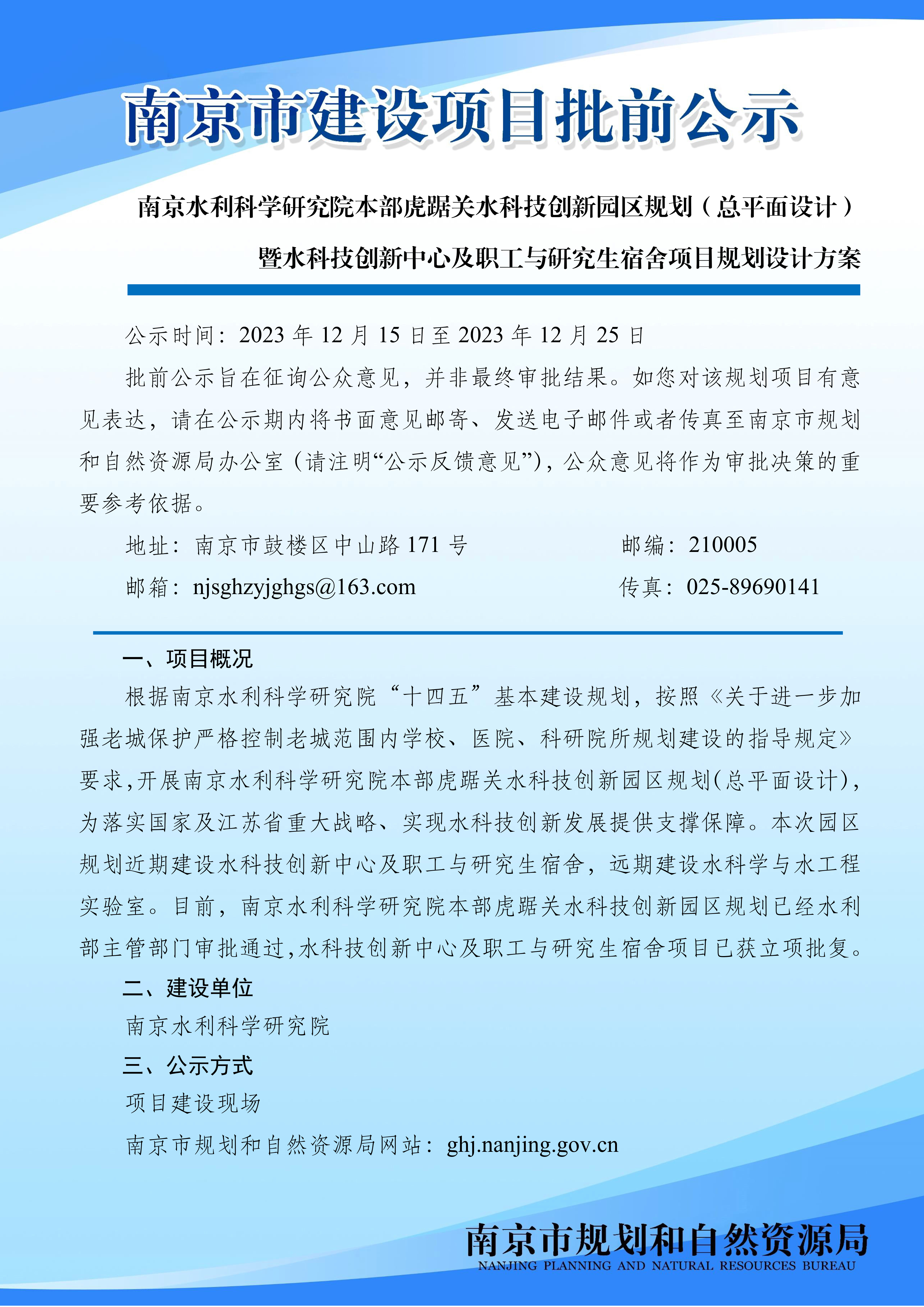 南京水利科学研究院水科技创新中心及职工与研究生宿舍项目规划设计方案批前公示