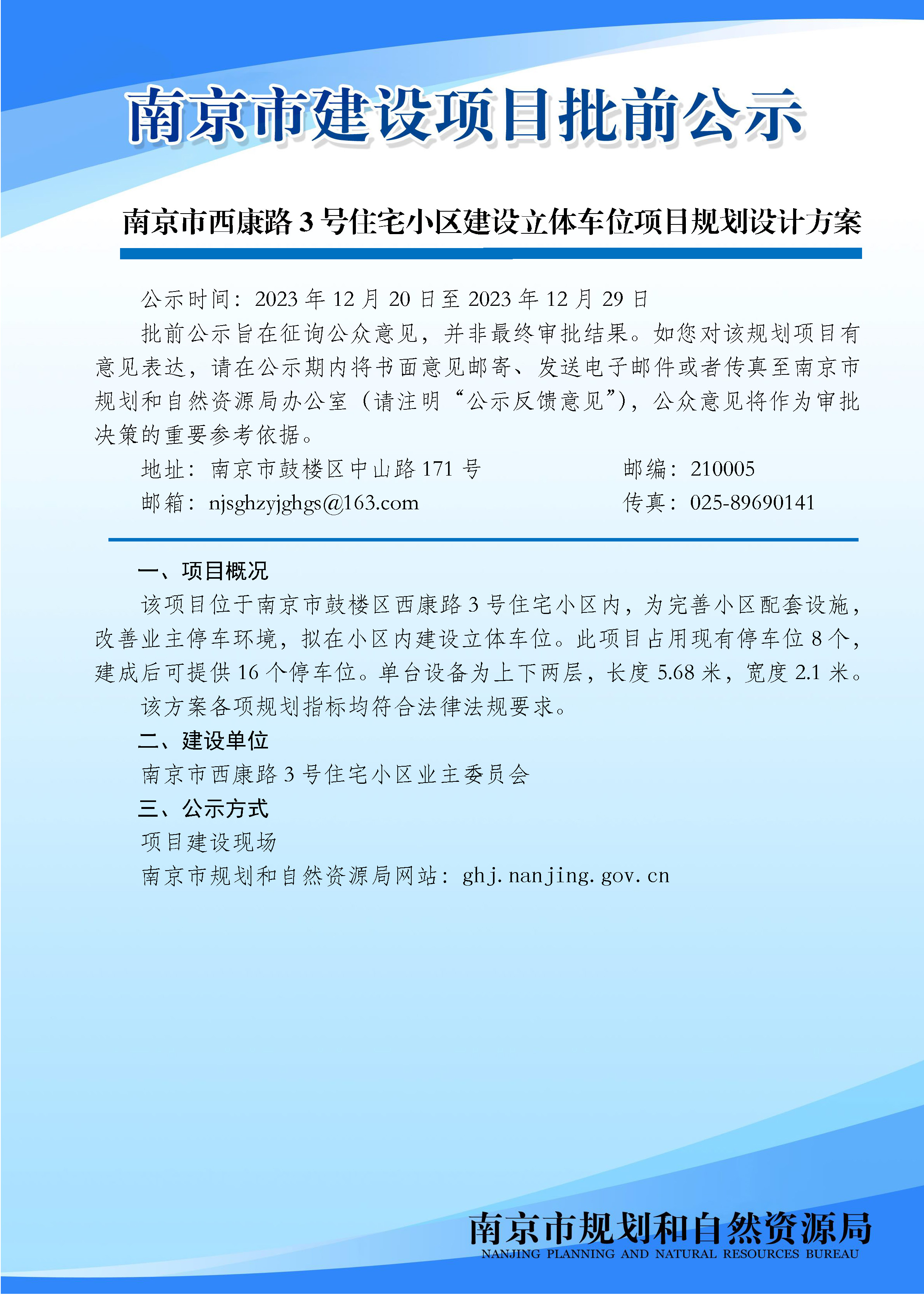 南京市西康路3号住宅小区建设立体车位项目规划设计方案批前公示