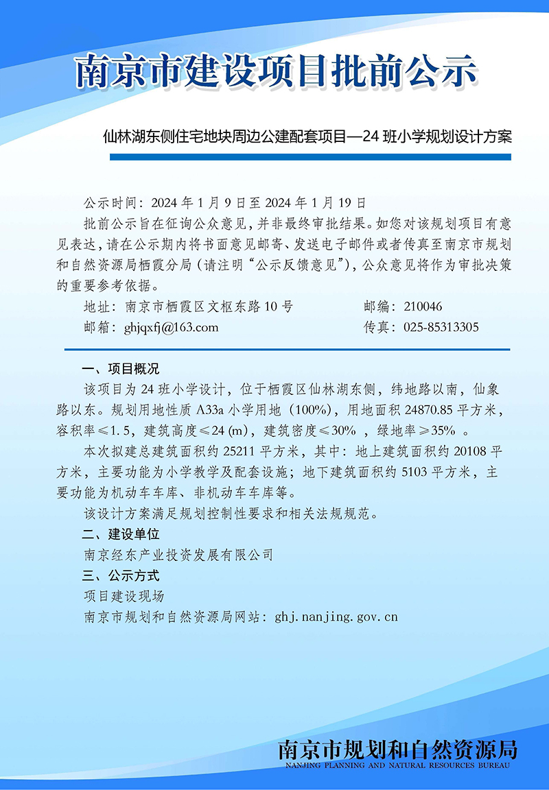 仙林湖东侧住宅地块周边公建配套项目—24班小学规划设计方案批前公示