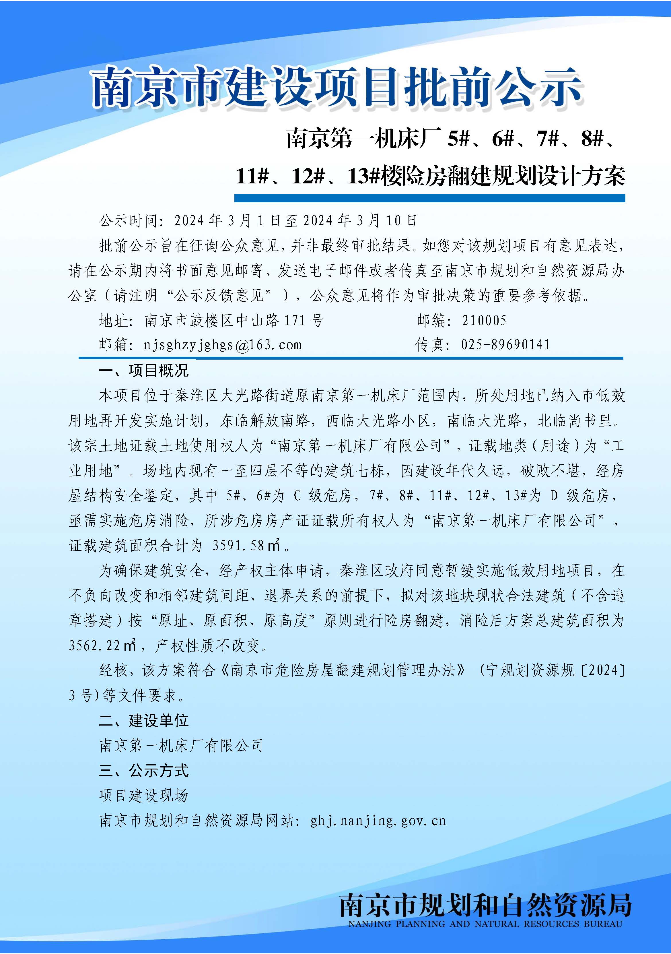 南京第一机床厂5#、6#、7#、8#、11#、12#、13#楼险房翻建规划设计方案批前公示