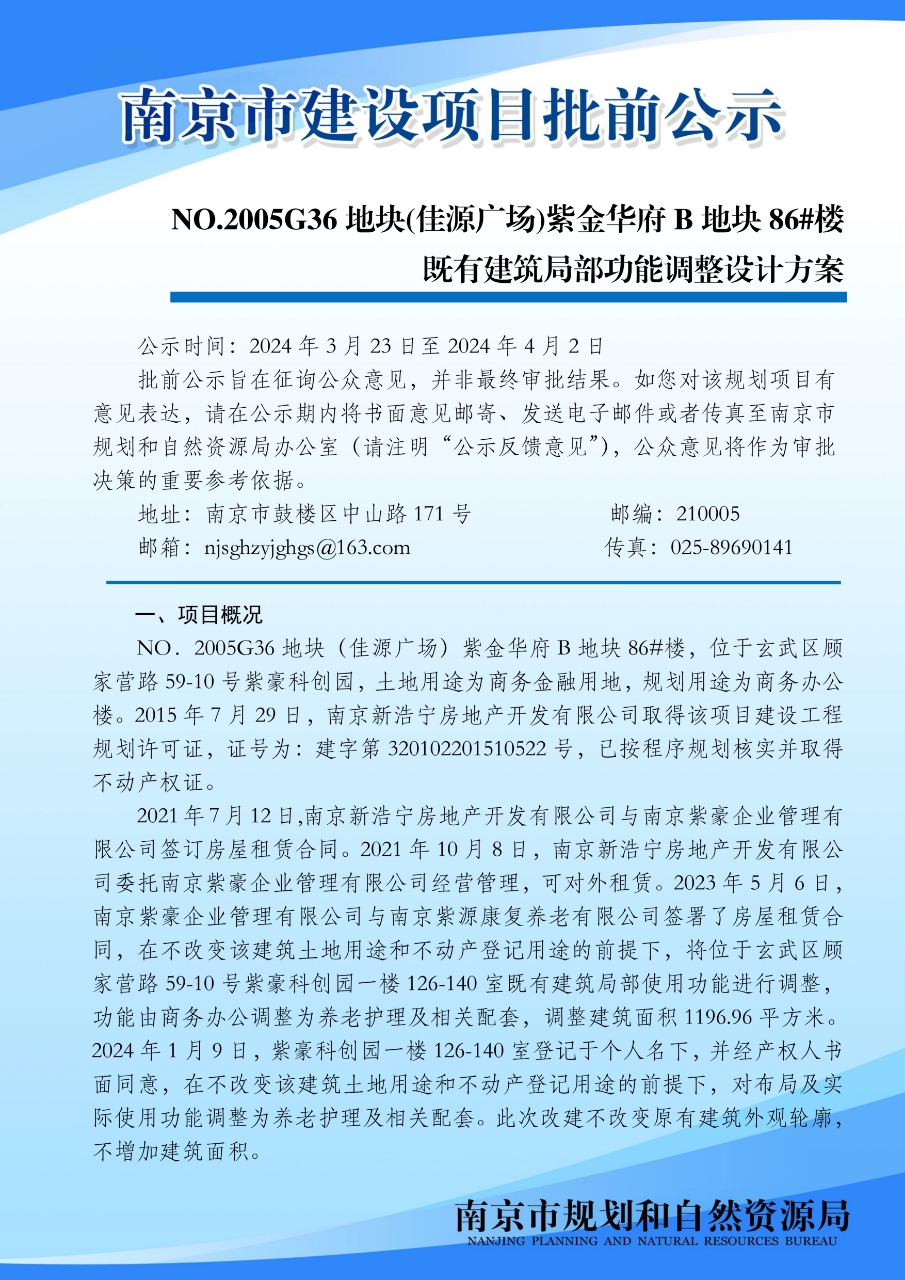 NO.2005G36地块(佳源广场)紫金华府B地块86#楼既有建筑局部功能调整设计方案批前公示