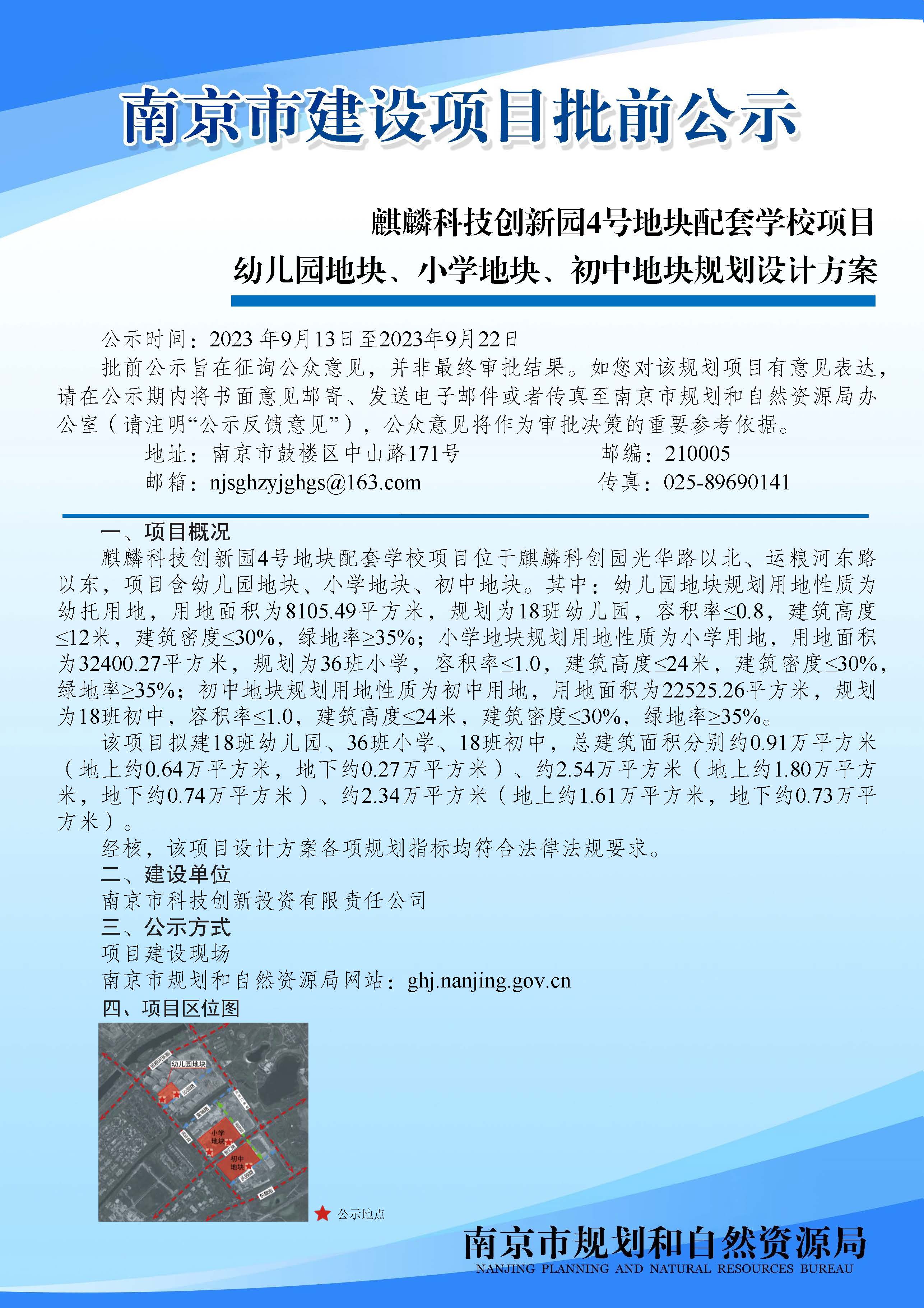 麒麟科技创新园4号地块配套学校项目幼儿园地块、小学地块、初中地块规划设计方案批前公示