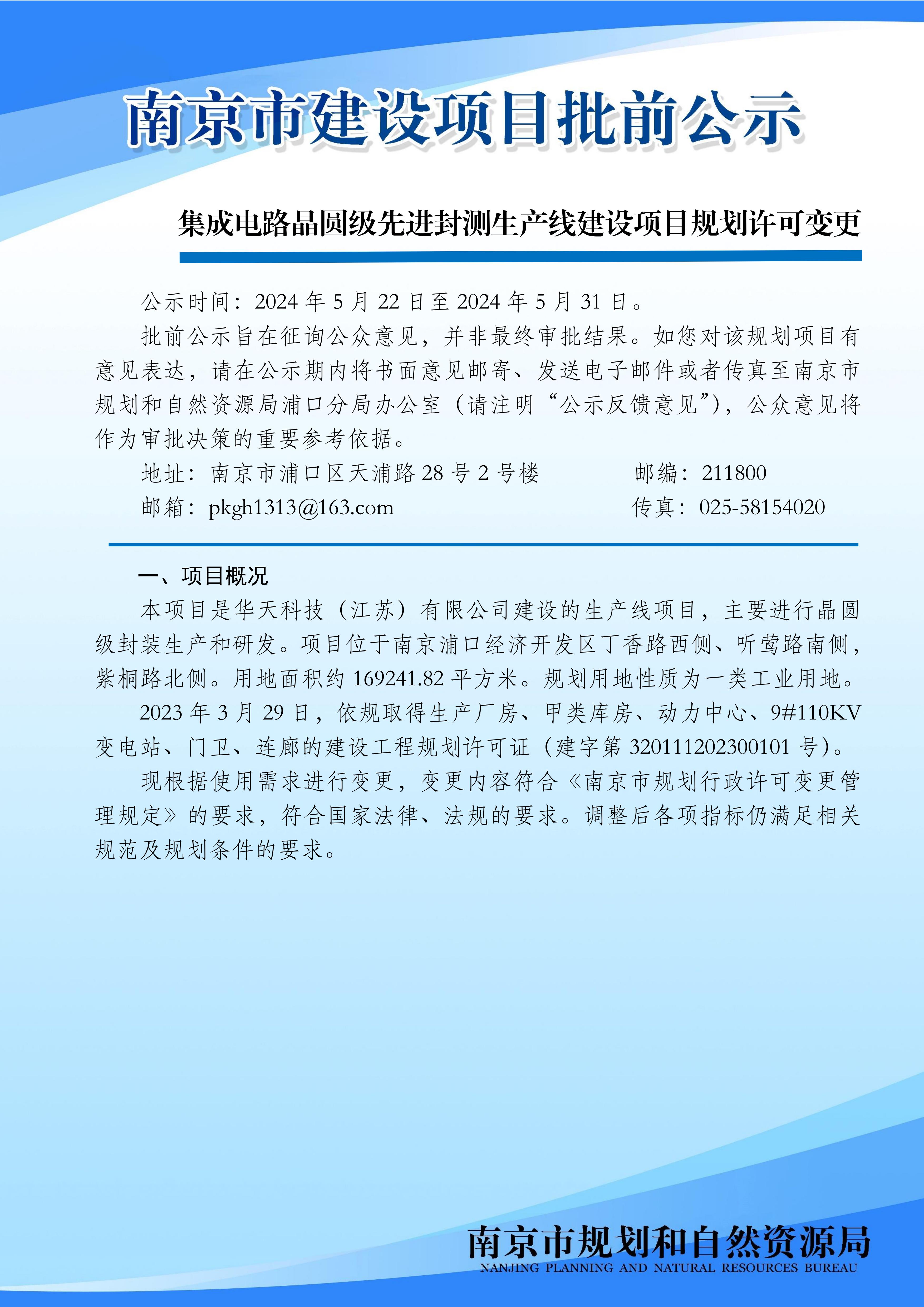 集成电路晶圆级先进封测生产线建设项目规划许可变更批前公示