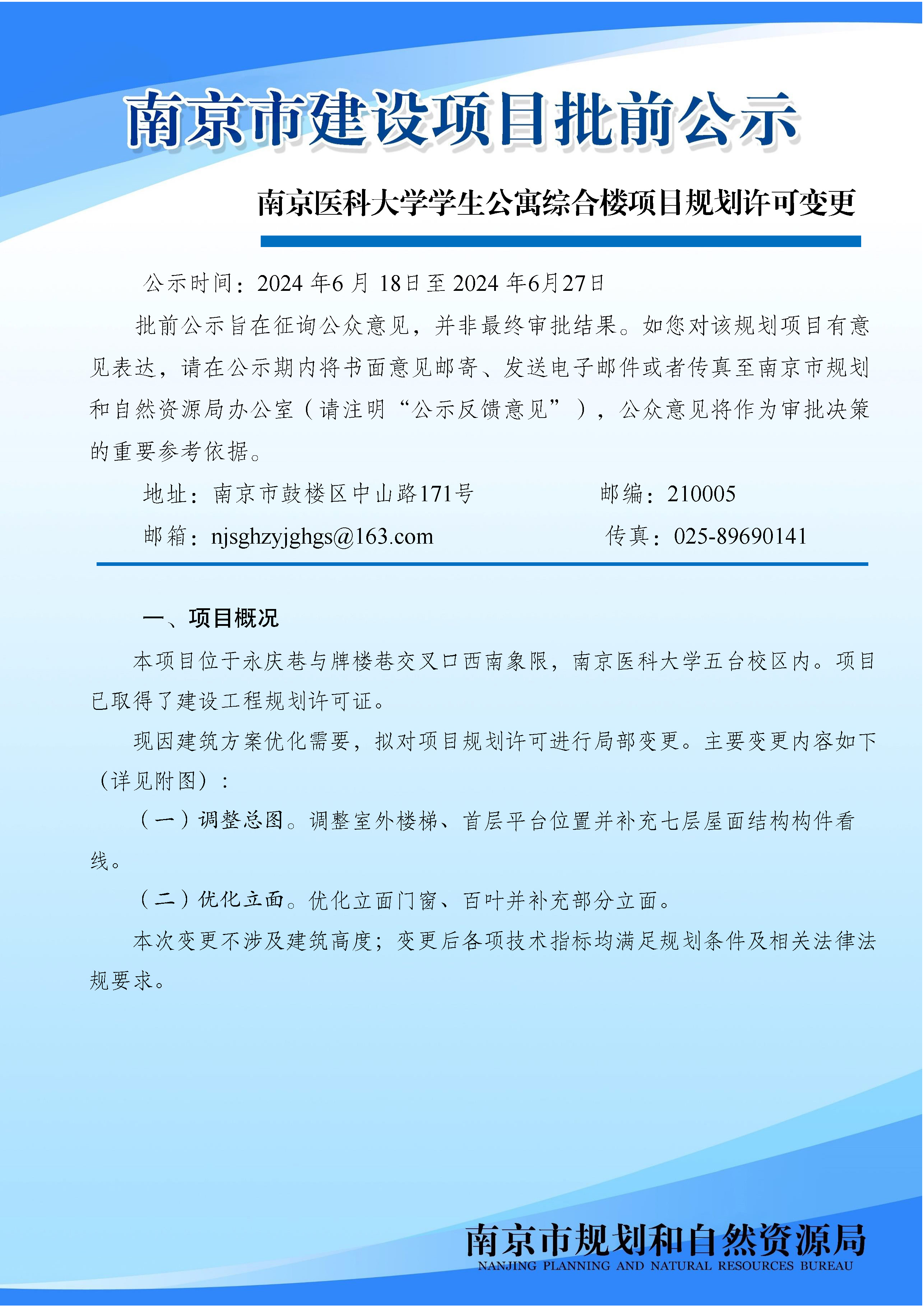 南京医科大学学生公寓综合楼项目规划许可变更批前公示
