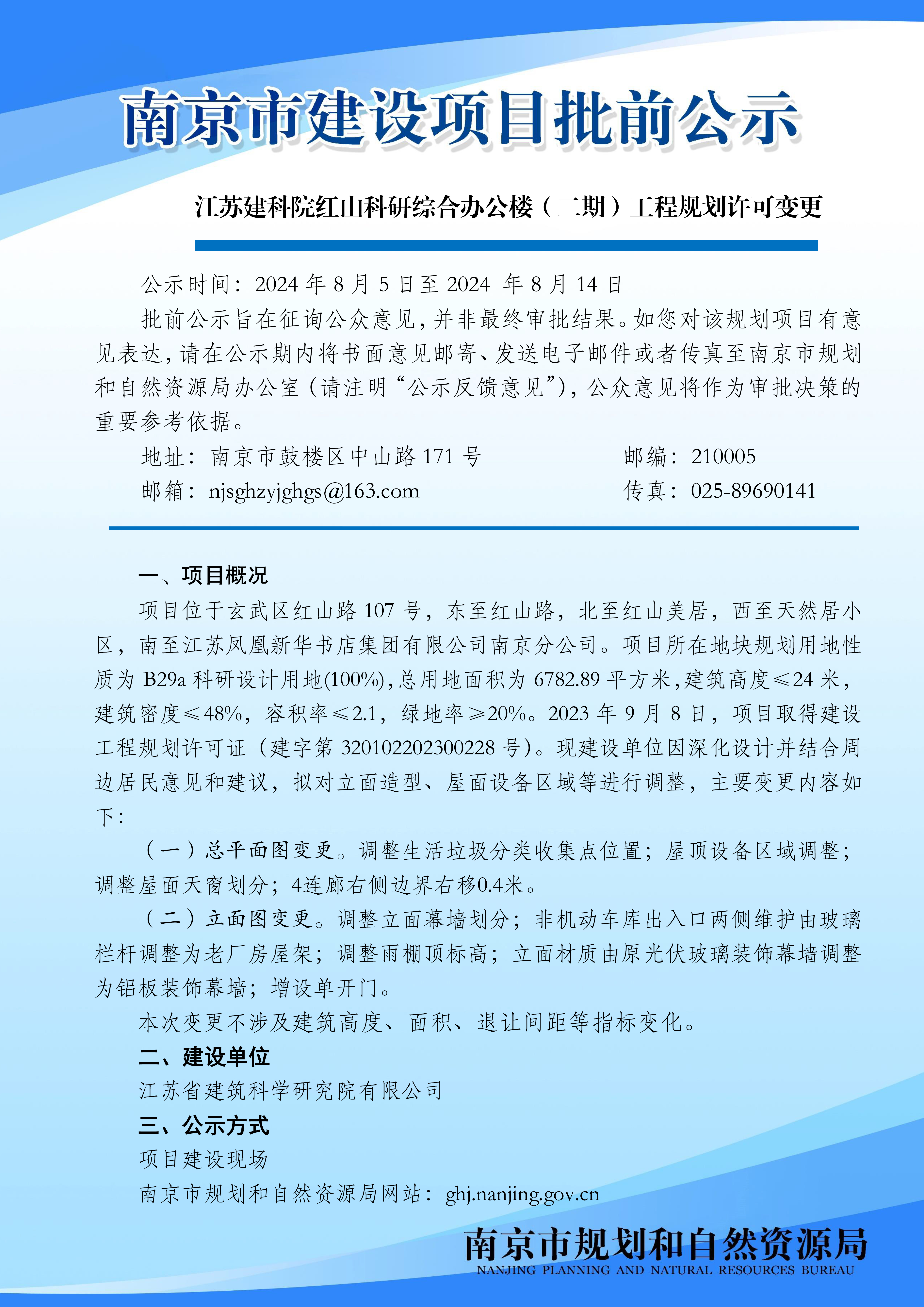 江苏建科院红山科研综合办公楼(二期)工程规划许可变更批前公示