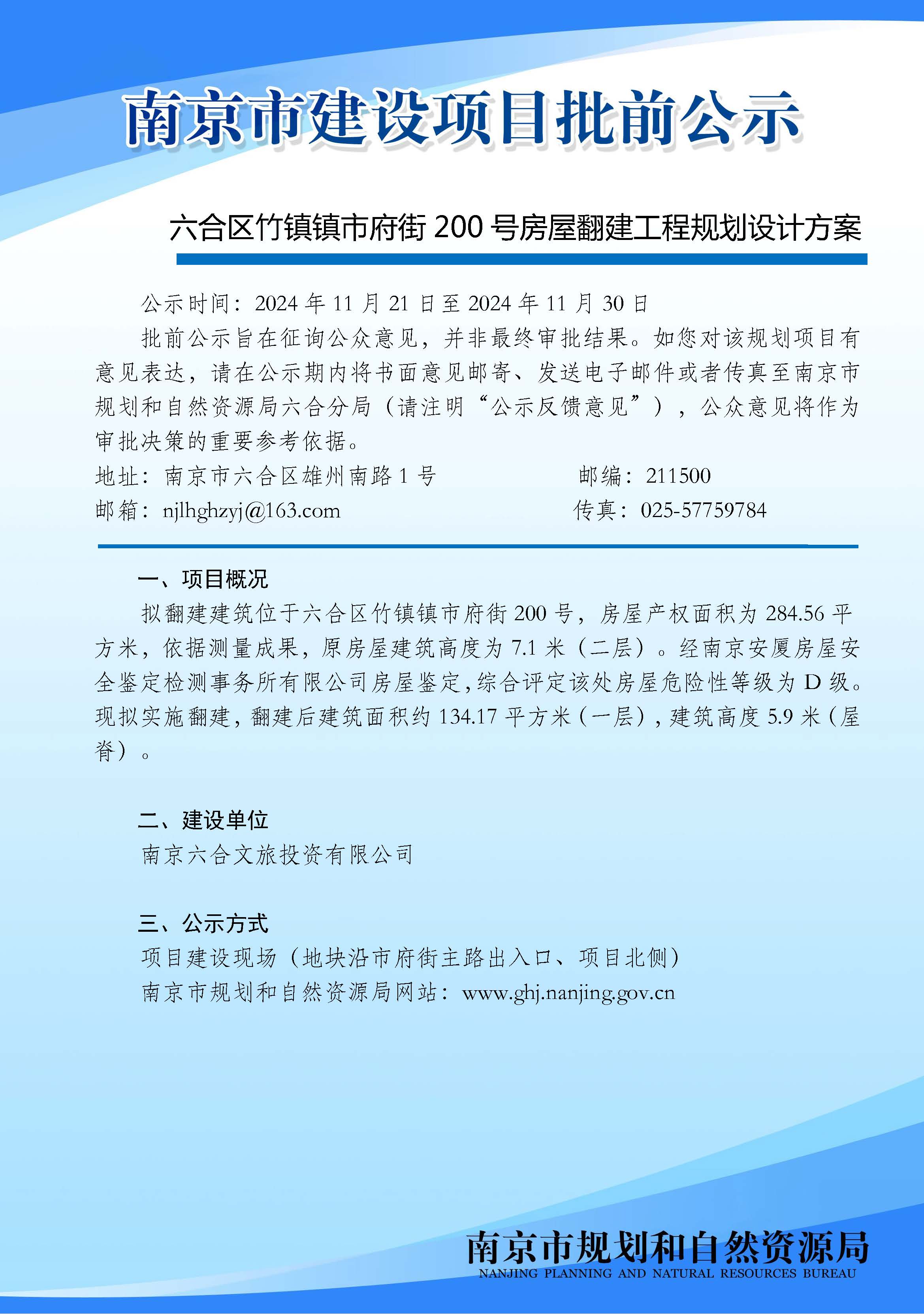 六合区竹镇镇市府街200号房屋翻建工程规划设计方案批前公示