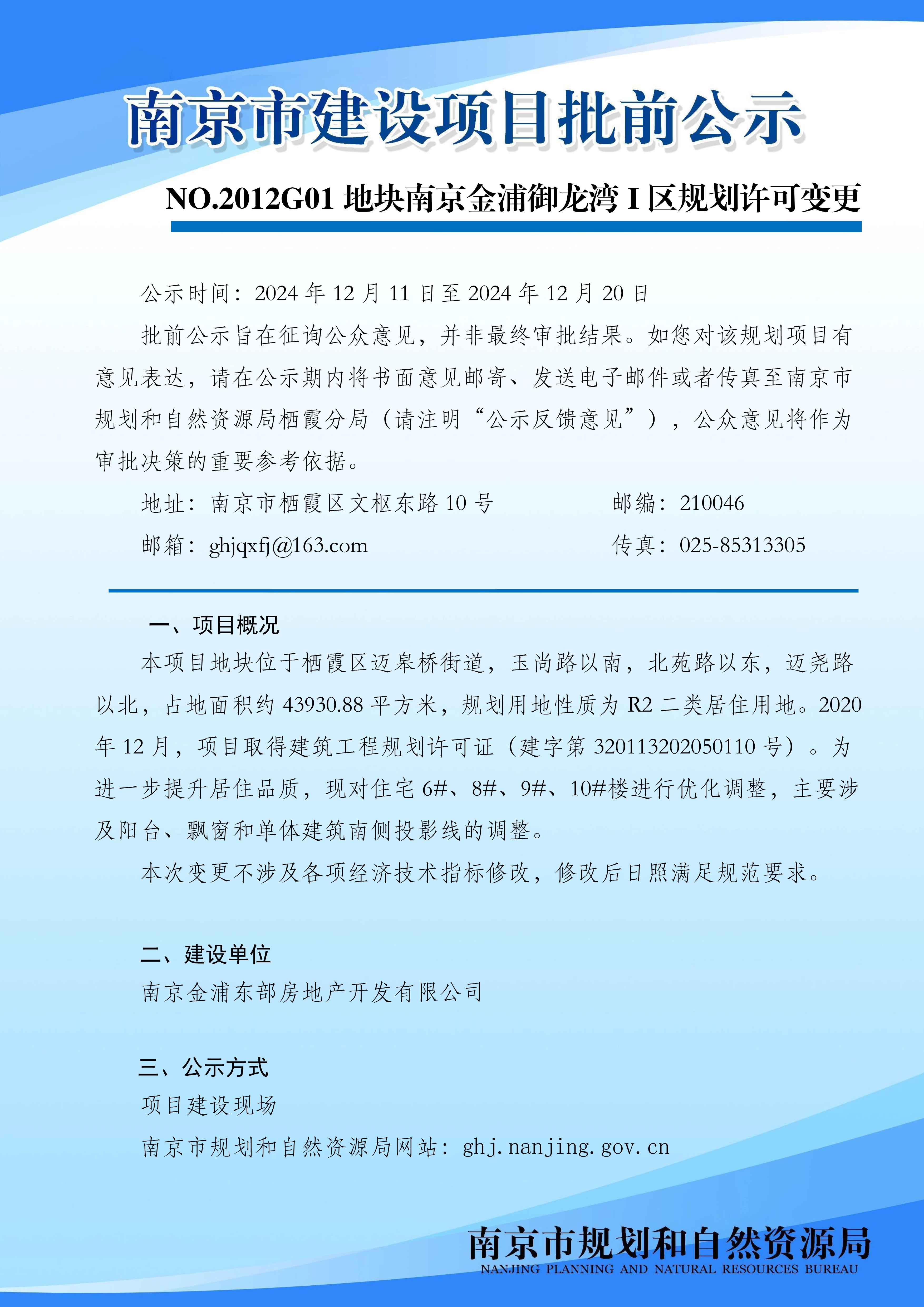 NO.2012G01地块南京金浦御龙湾I区规划许可变更批前公示