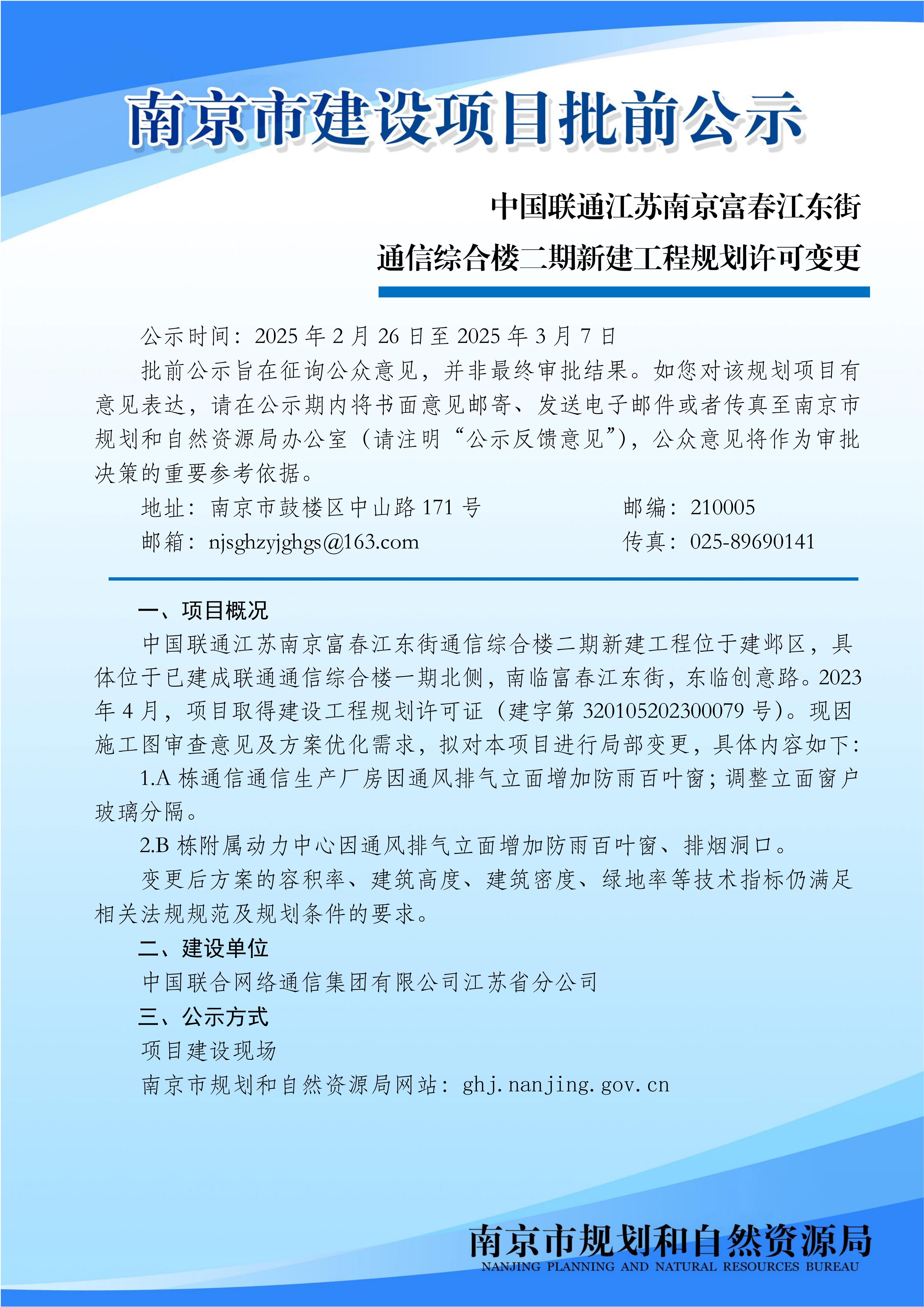 中国联通江苏南京富春江东街通信综合楼二期新建工程规划许可变更批前公示