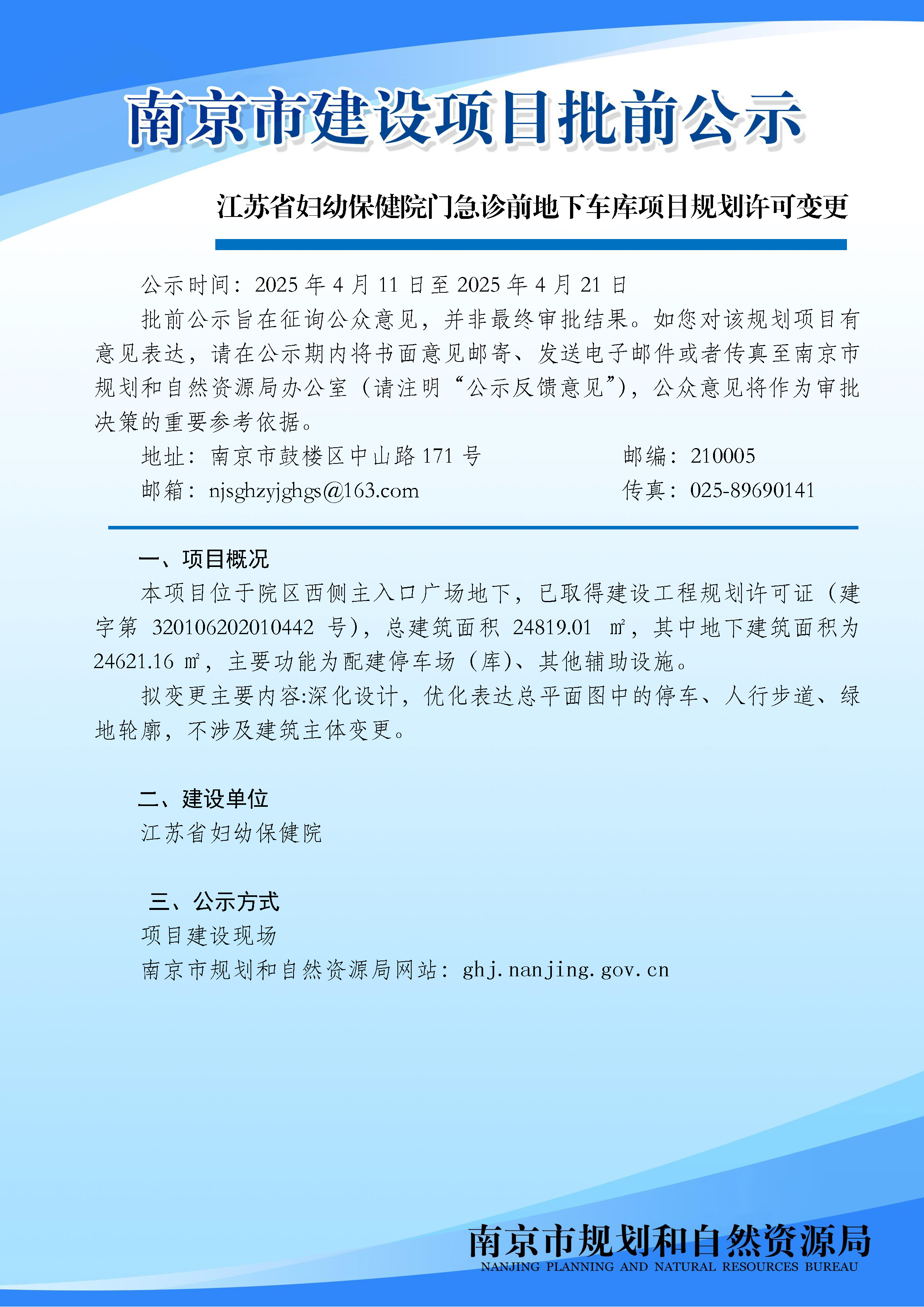 江苏省妇幼保健院门急诊前地下车库项目规划许可变更批前公示