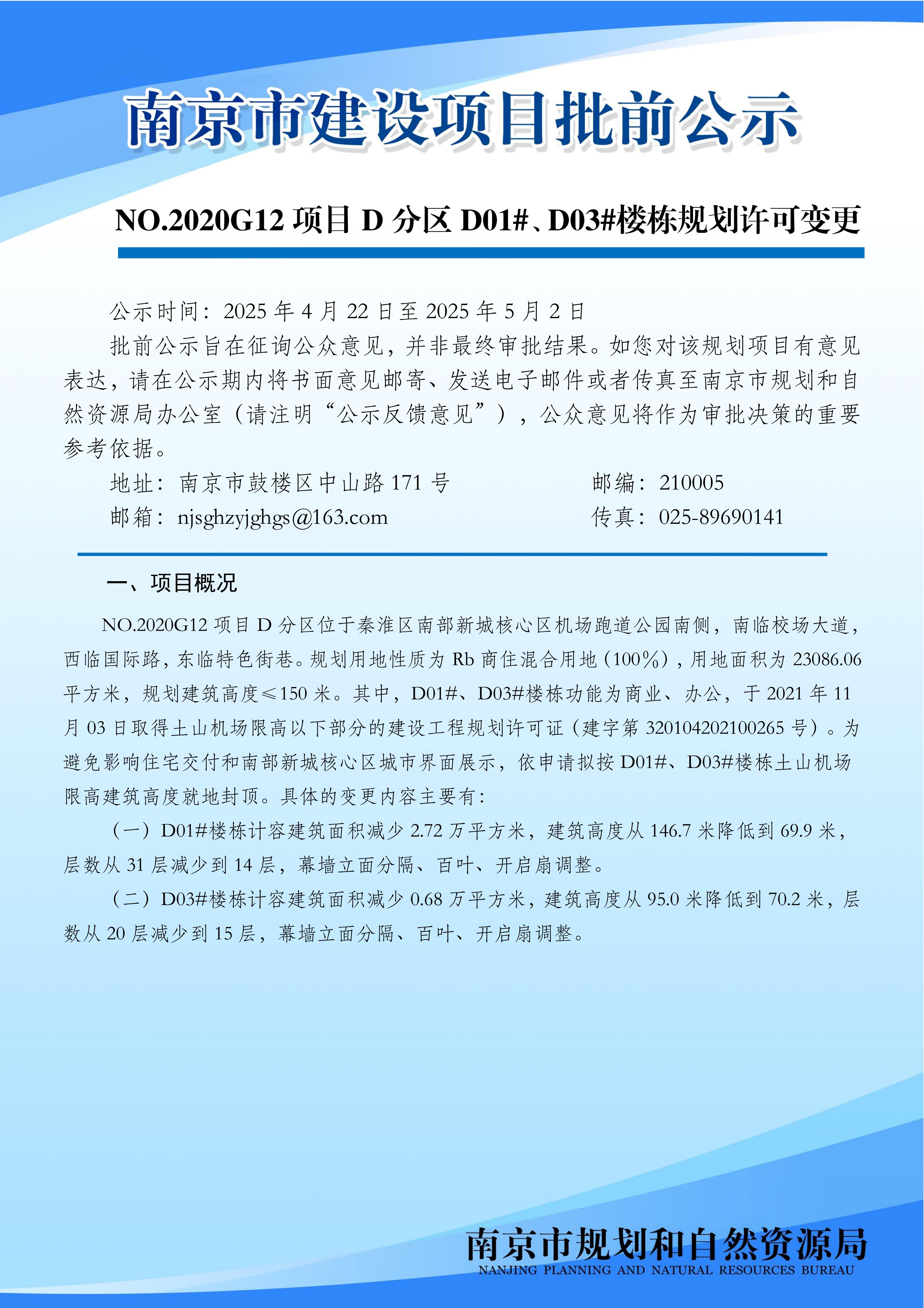 NO.2020G12项目D分区D01#、D03#楼栋规划许可变更批前公示