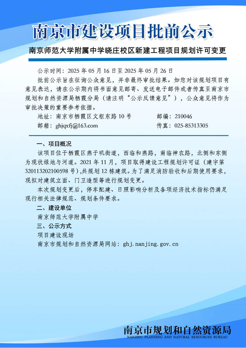 南京师范大学附属中学晓庄校区新建工程项目规划许可变更批前公示