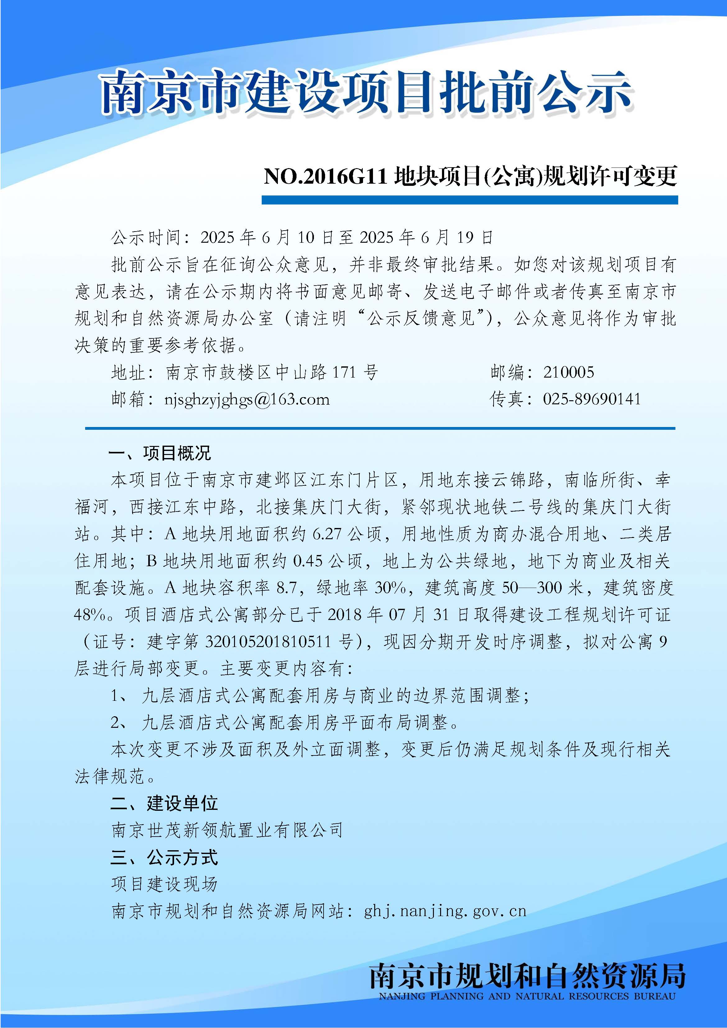 NO.2016G11地块项目(公寓)规划许可变更批前公示