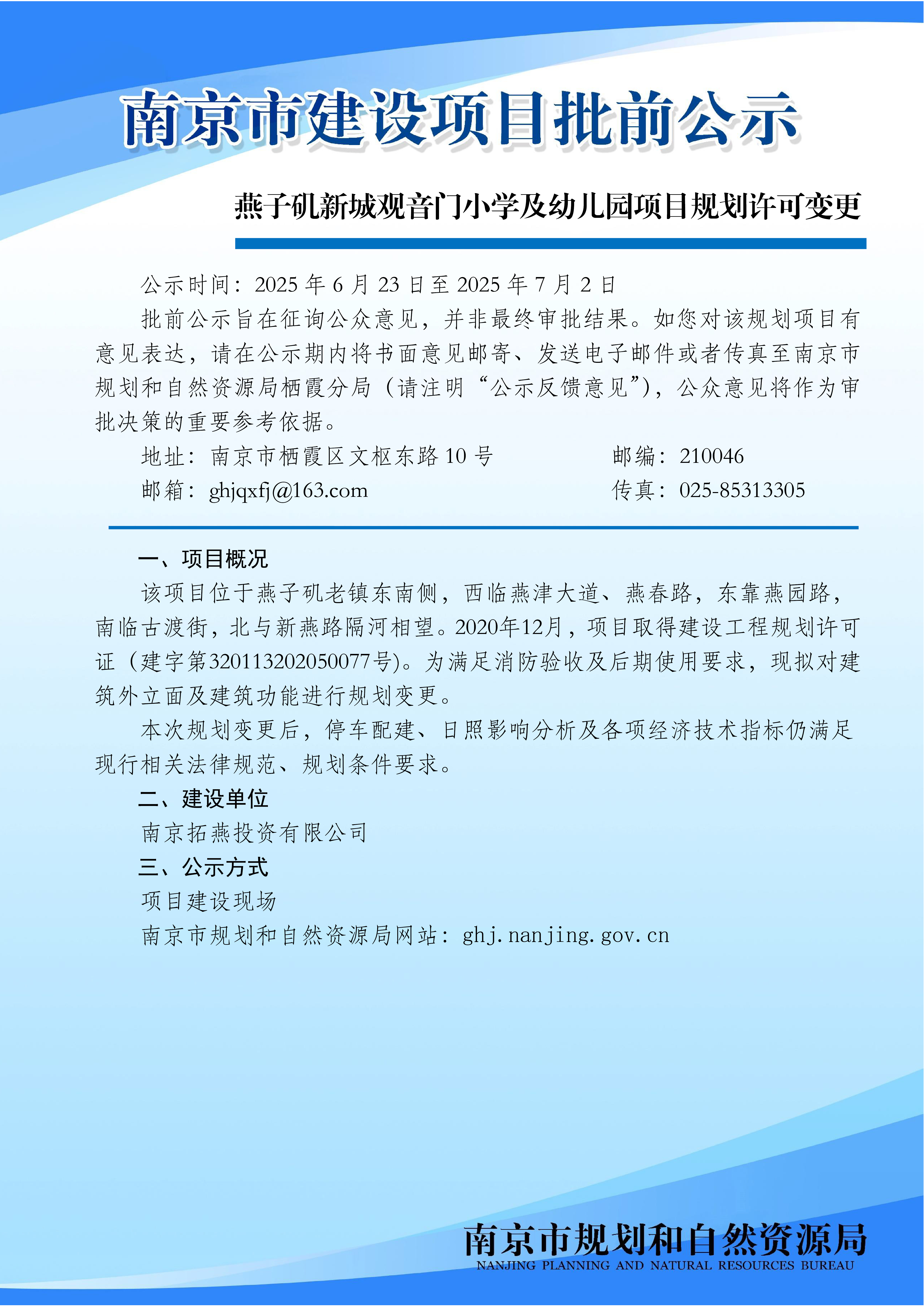 燕子矶新城观音门小学及幼儿园项目规划许可变更