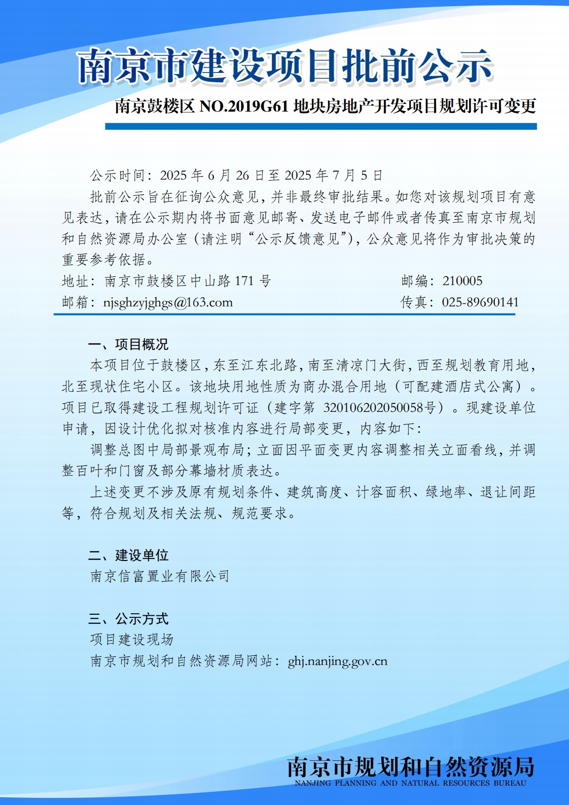 南京鼓楼区NO.2019G61地块房地产开发项目规划许可变更批前公示