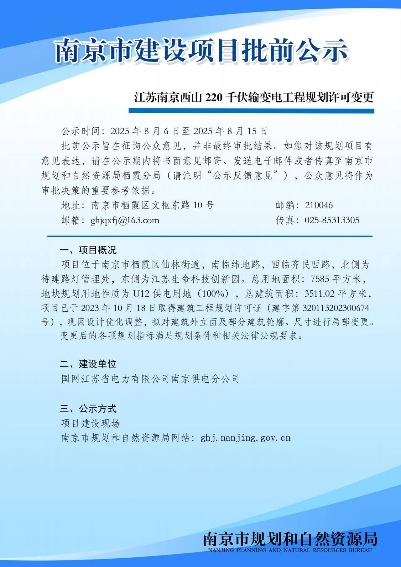 江苏南京西山220千伏输变电工程规划许可变更批前公示