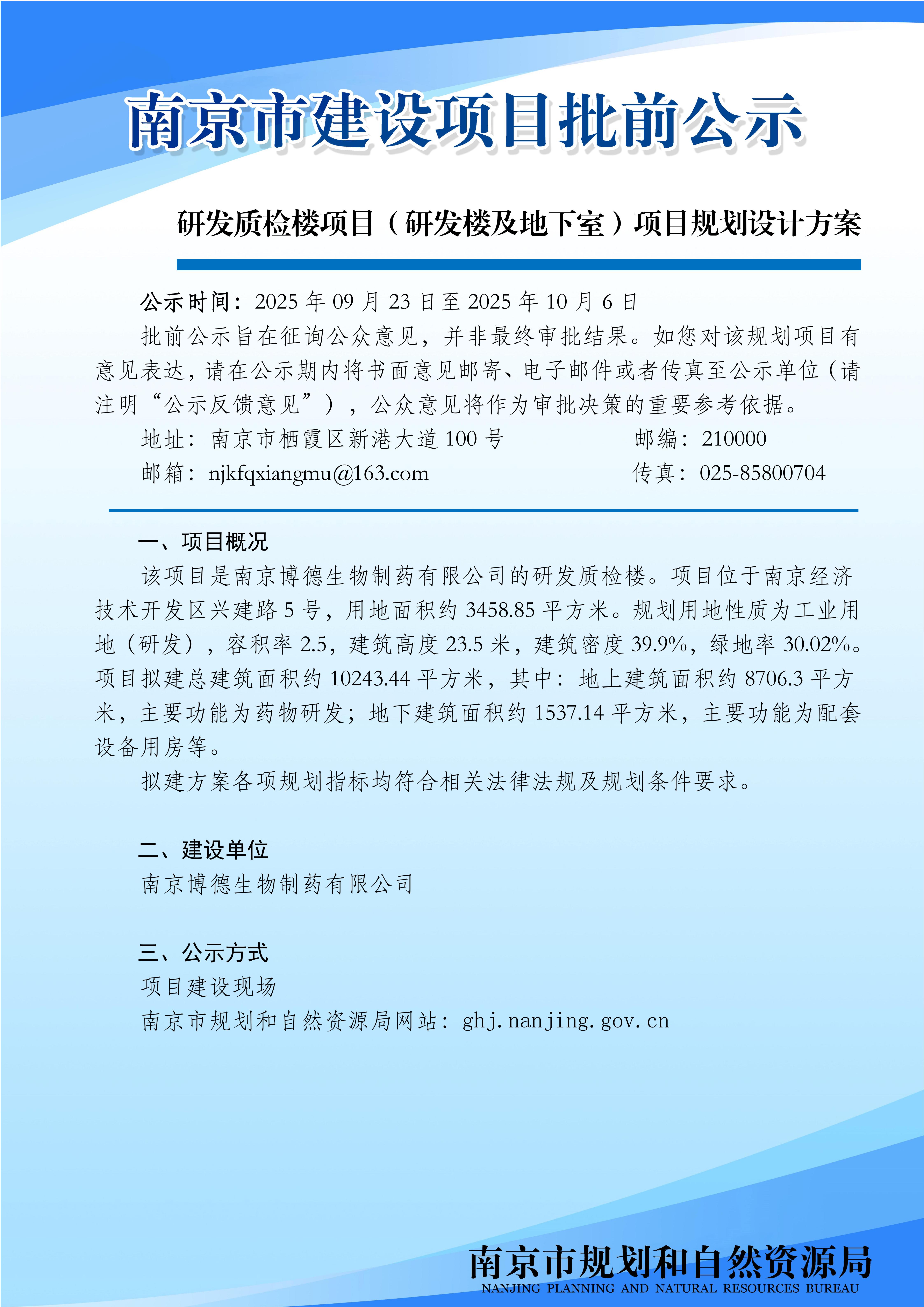 研发质检楼项目(研发楼及地下室)项目规划设计方案批前公示