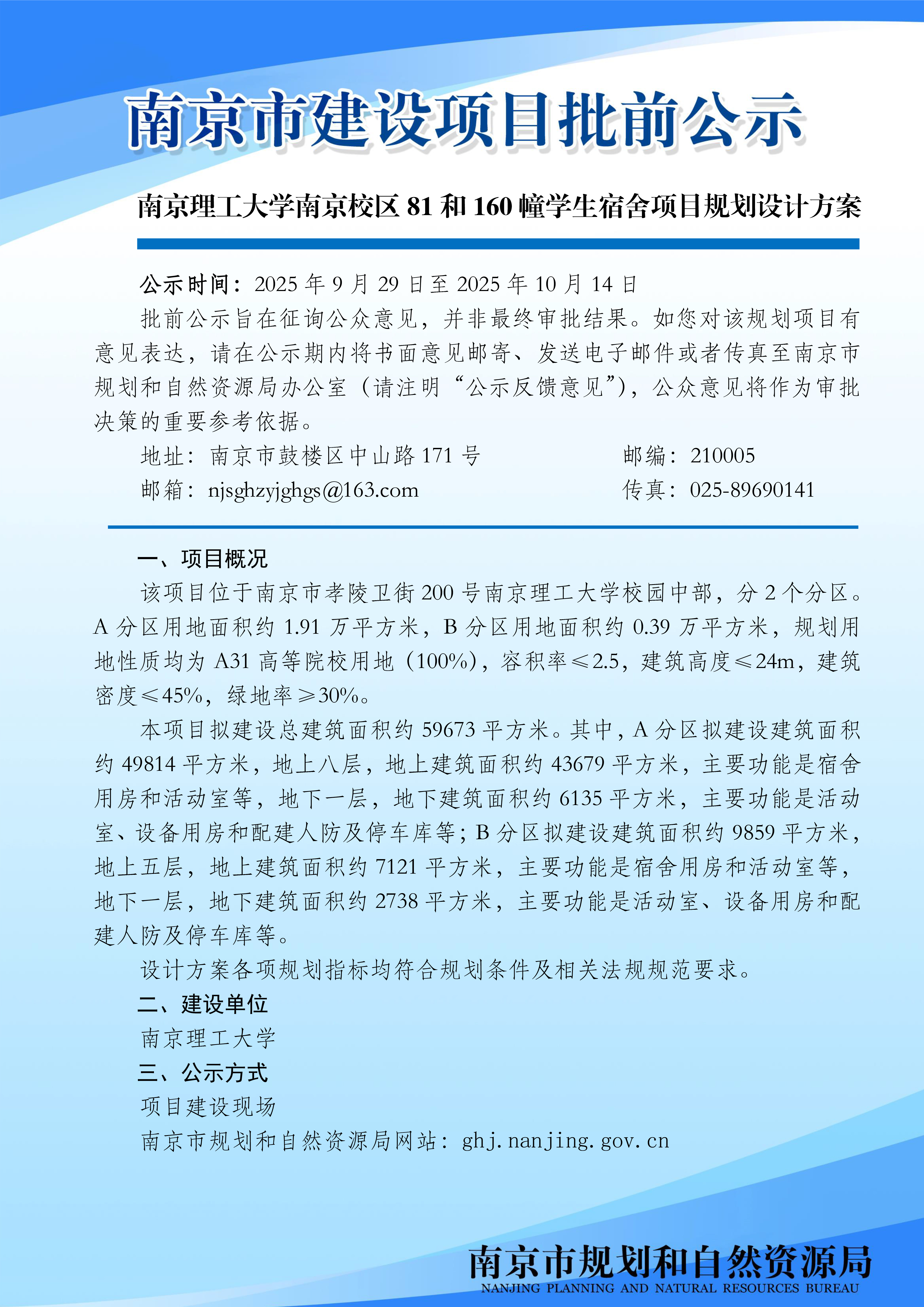 南京理工大学南京校区81和160幢学生宿舍项目规划设计方案批前公示