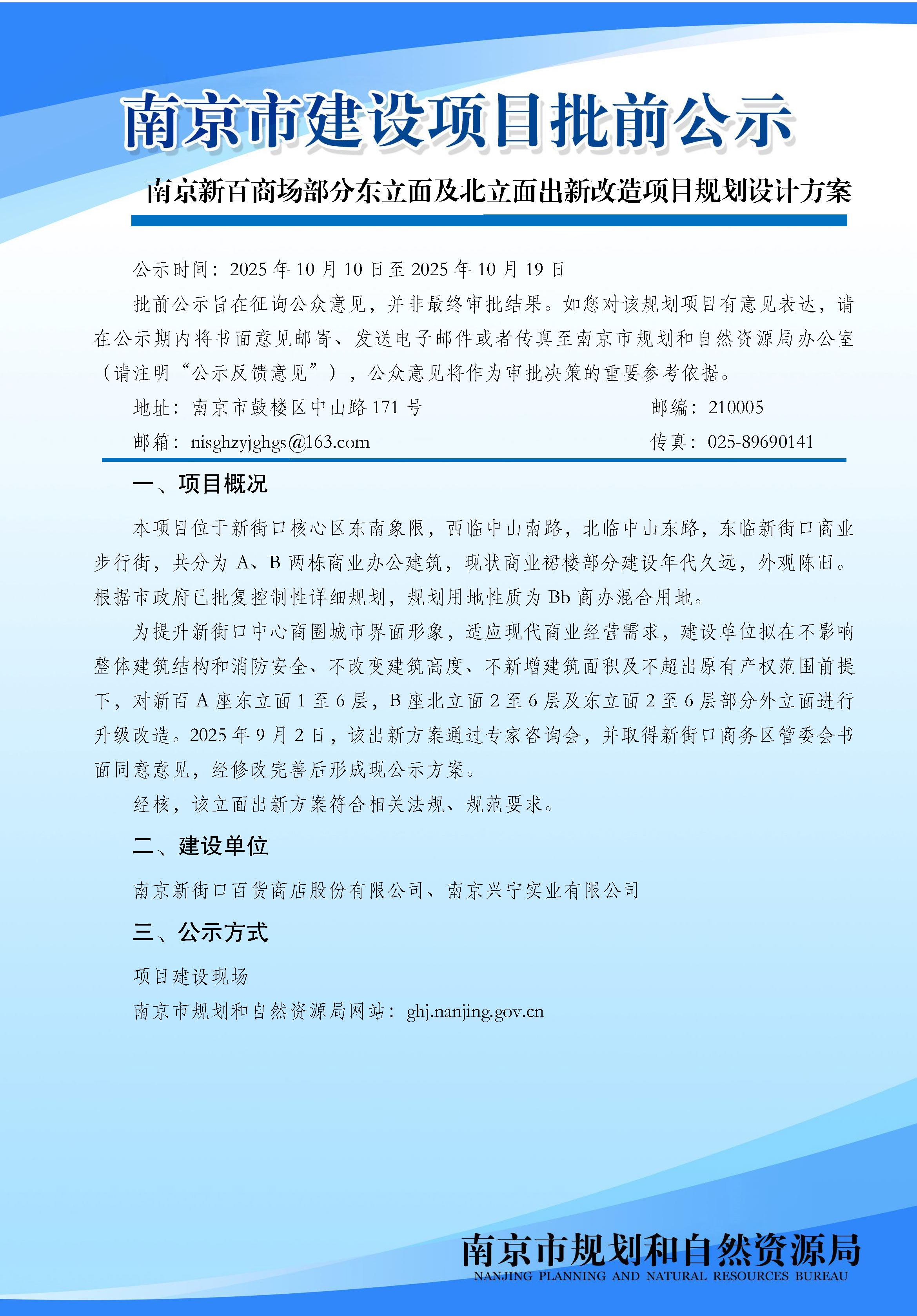 南京新百商场部分东立面及北立面出新改造项目规划设计方案批前公示