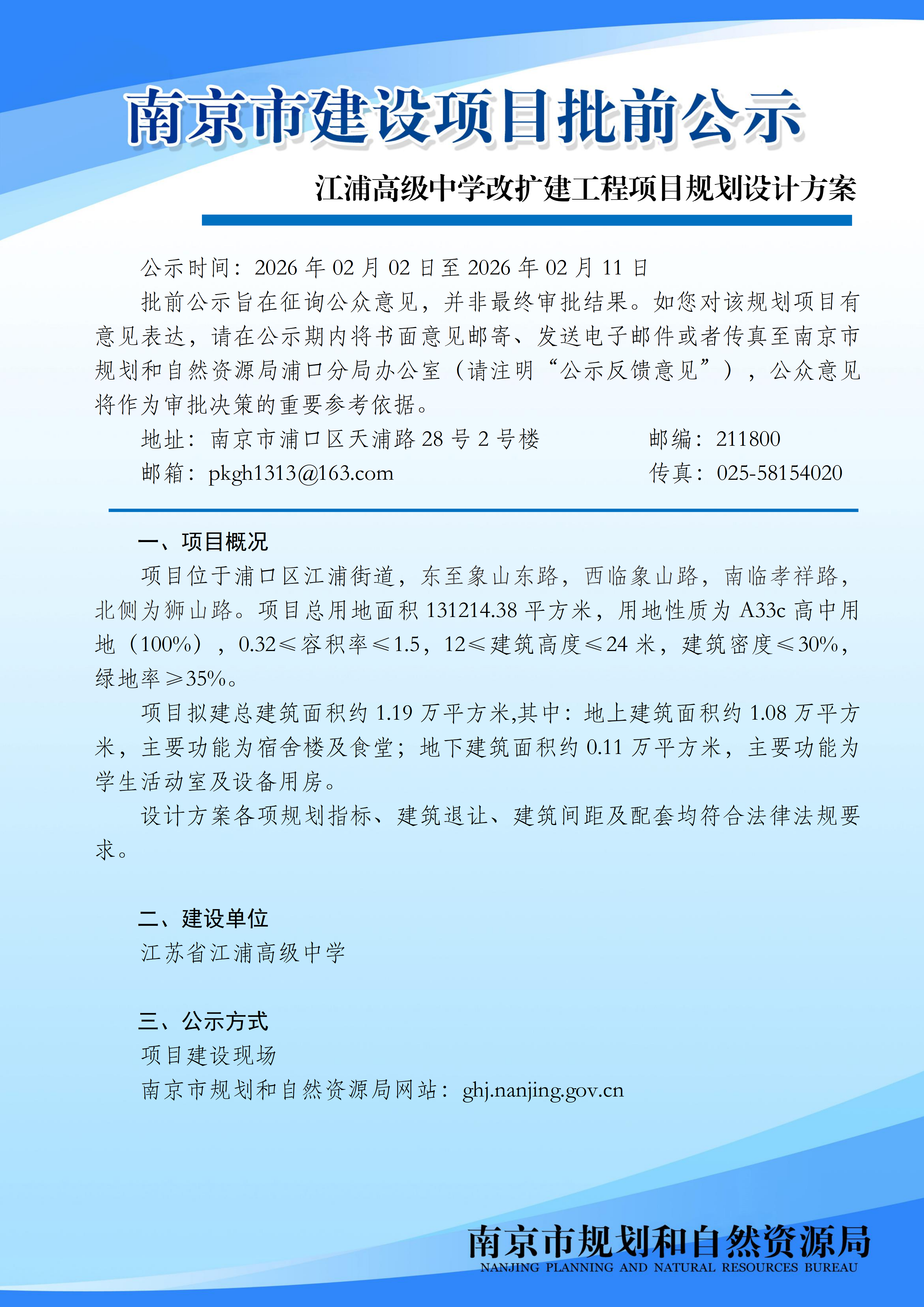 江浦高级中学改扩建工程项目规划设计方案批前公示