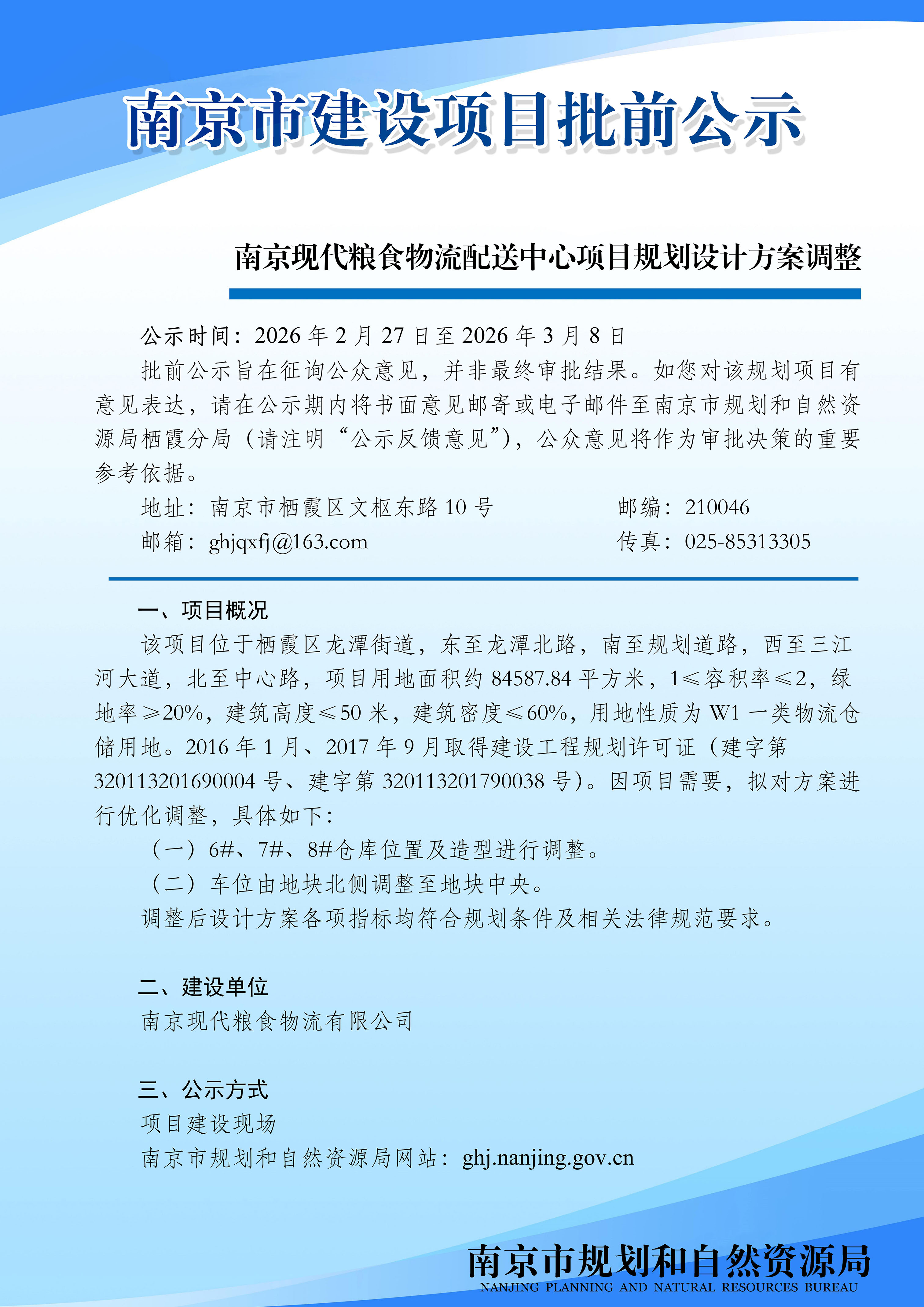 南京现代粮食物流配送中心项目规划设计方案调整批前公示