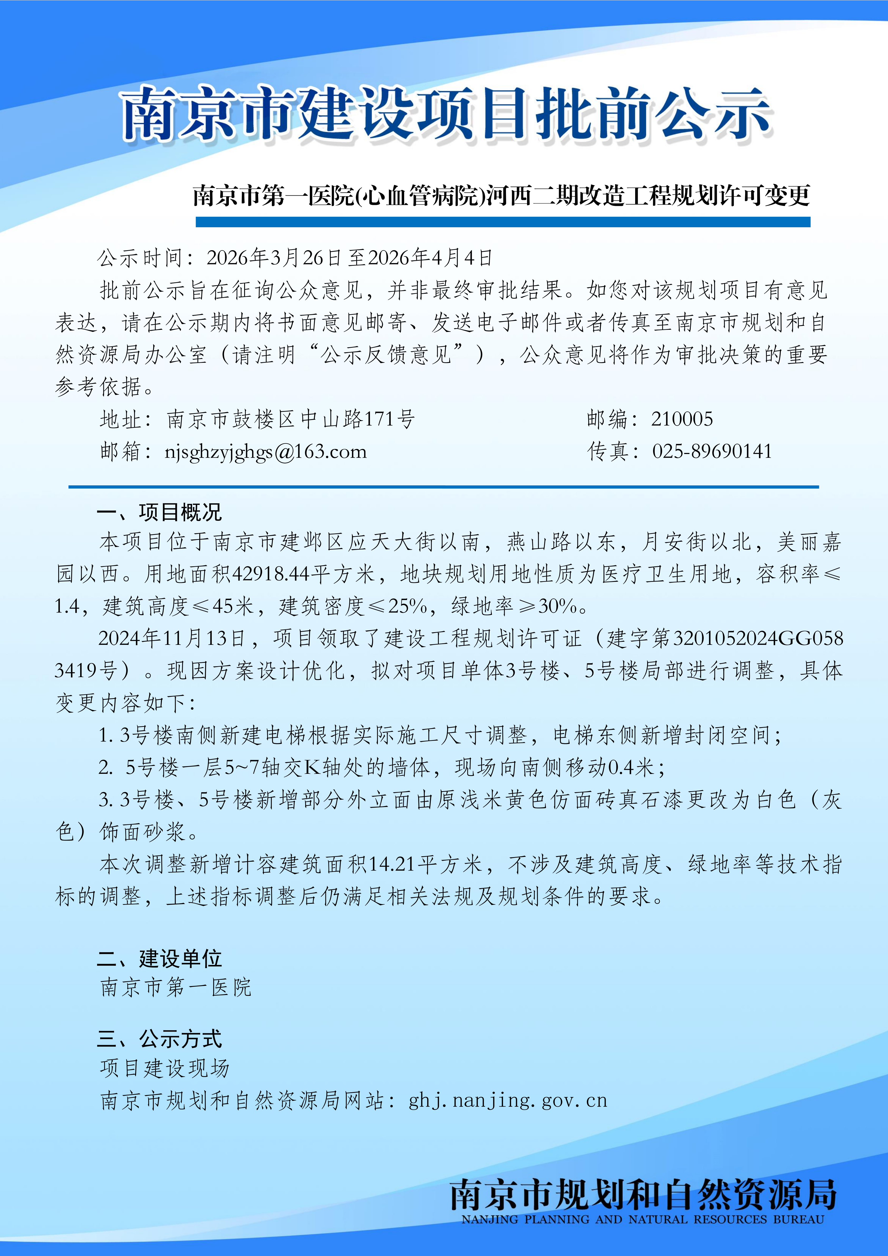 南京市第一医院(心血管病院)河西二期改造工程规划许可变更批前公示