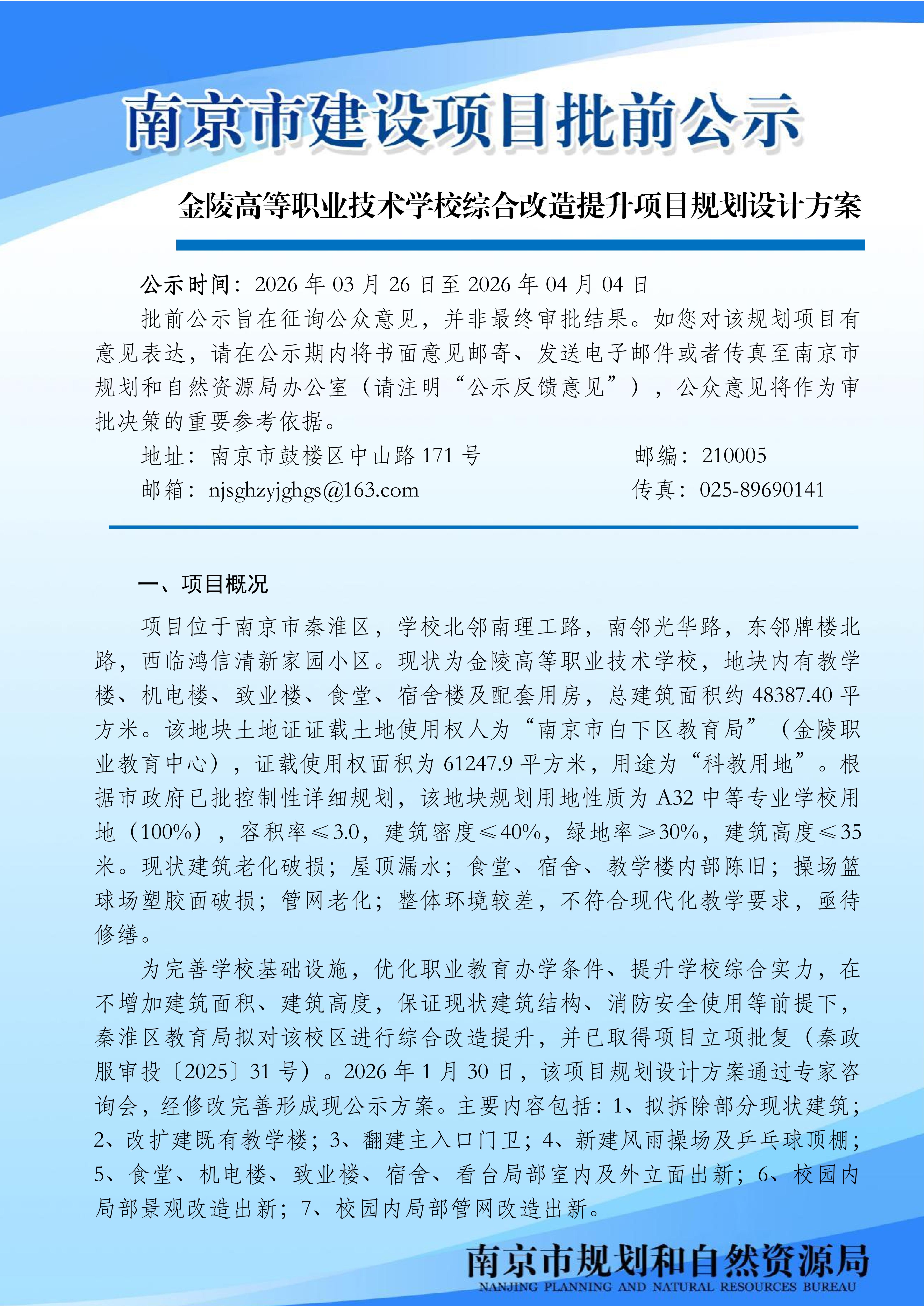 金陵高等职业技术学校综合改造提升项目设计方案批前公示
