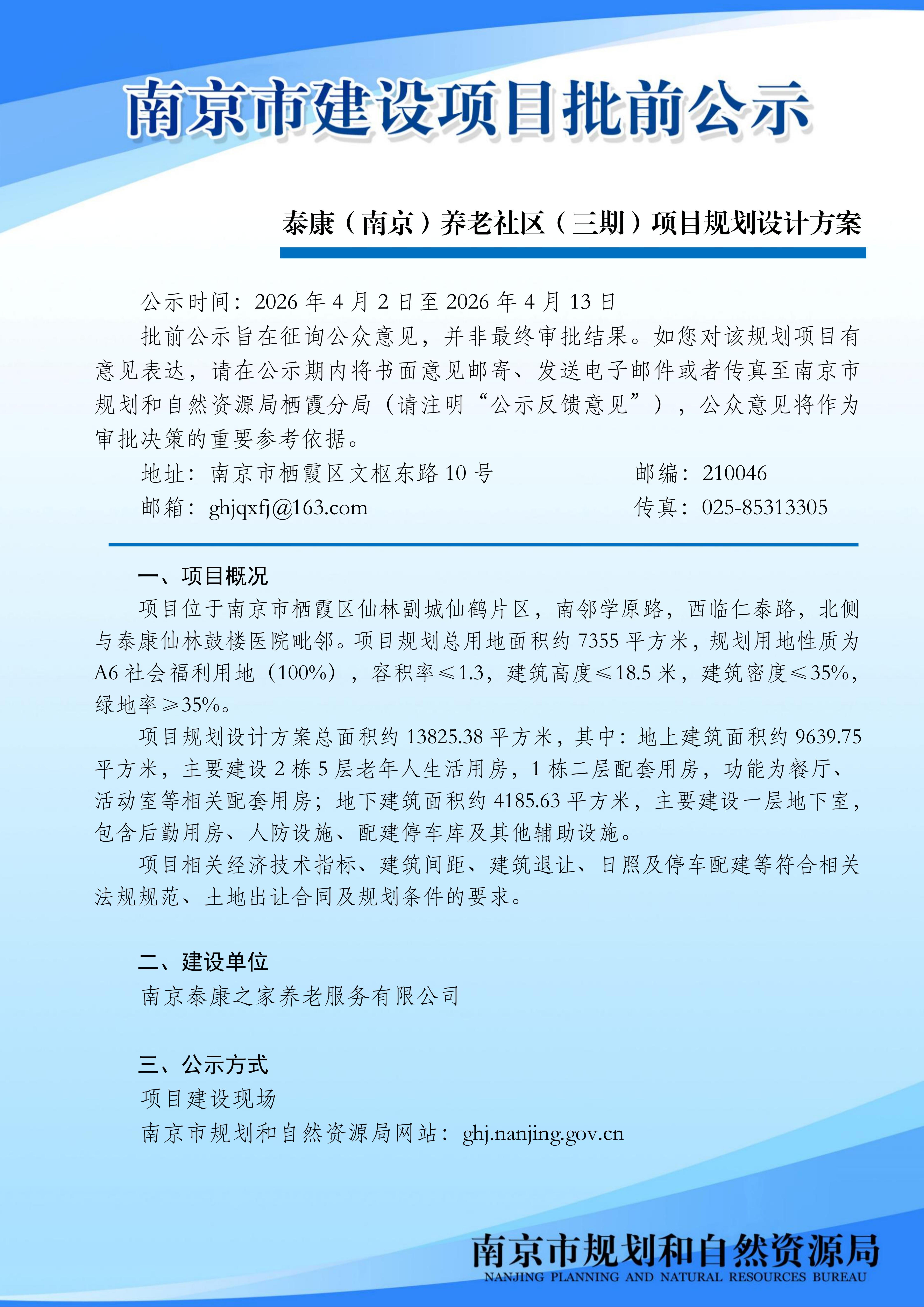 泰康(南京)养老社区(三期)项目规划设计方案批前公示